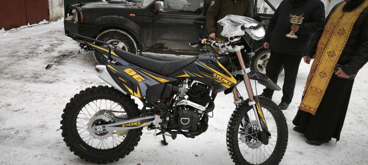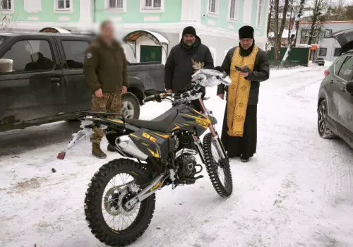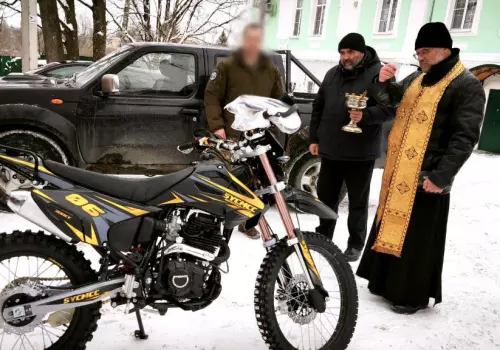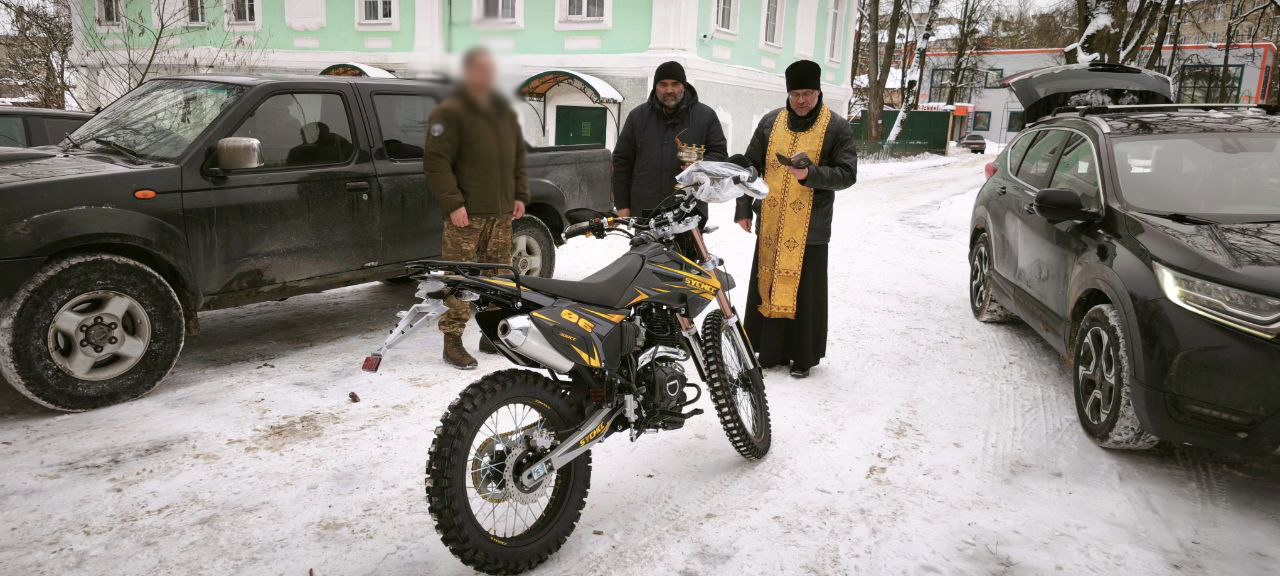 Протоиерей Валерий Калинин перед отправкой мотоцикла совершил напутственный молебен и окропил святой водой мотоцикл и автомобиль, на котором он будет доставлен в Воинскую часть.